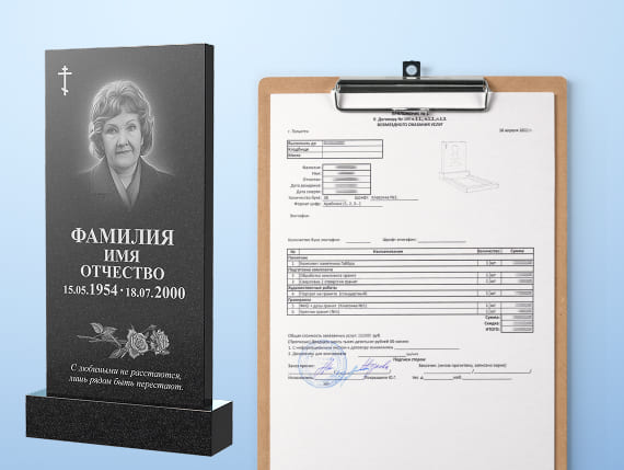 Вносим данные заказчика и данные умершего в договор. В приложении к договору подробно расписываем все составляющие заказа, общую стоимость, сроки изготовления и установки.